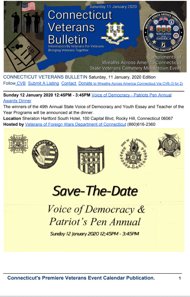 CONNECTICUT VETERANS BULLETIN(CVB), 11 January, 2020 Edition is available for download.