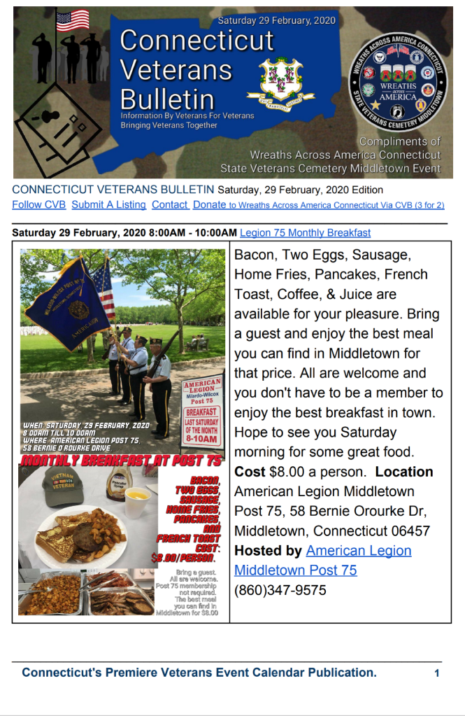 CONNECTICUT VETERANS BULLETIN(CVB), 29 February, 2020 Edition is available for download.