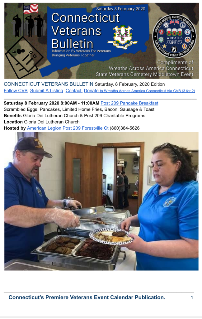 CONNECTICUT VETERANS BULLETIN(CVB), 8 February, 2020 Edition is available for download.