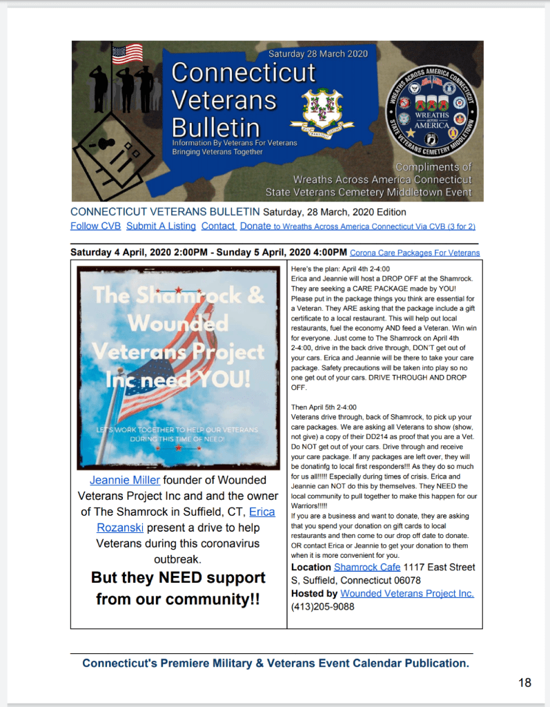 CONNECTICUT VETERANS BULLETIN 28 March, 2020 Edition is available for immediate download!! CVB is working to provide information, in light of COVID-19, of events and programs of benefit to CT Military, Veterans, Family & Advocates.