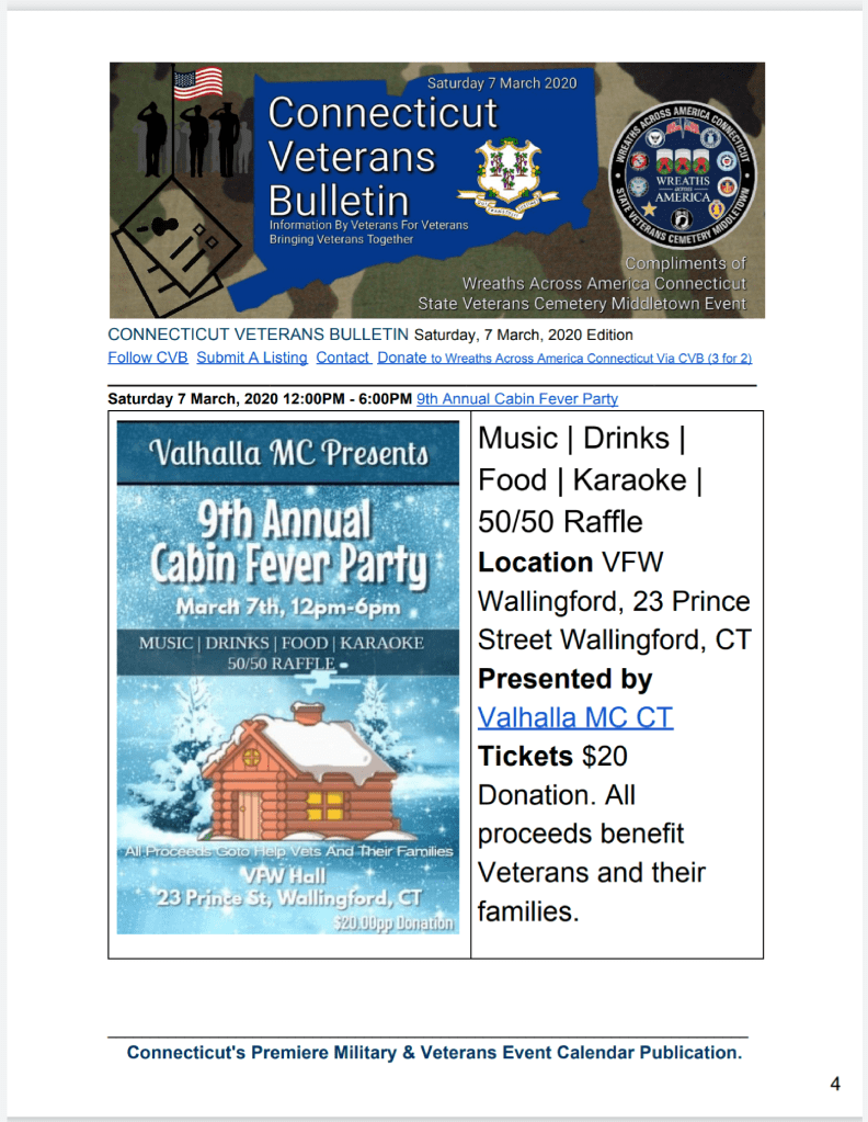CONNECTICUT VETERANS BULLETIN 7 March, 2020 Edition is available for immediate download!! Exponentially more than ever, with 136 pages of events and programs of interest to CT Military, Veterans, Family & Advocates.