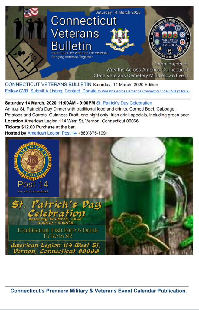 CONNECTICUT VETERANS BULLETIN(CVB), 14 March, 2020 Edition is available for download.