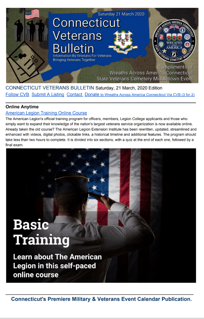 CVB serves Connecticut’s military/veteran community by researching and promoting events of interest from numerous resources. Each CVB event is listed with a dedicated page in bulletin format and remains listed in all subsequent issues, up to the Saturday before the event or the Saturday of the event.