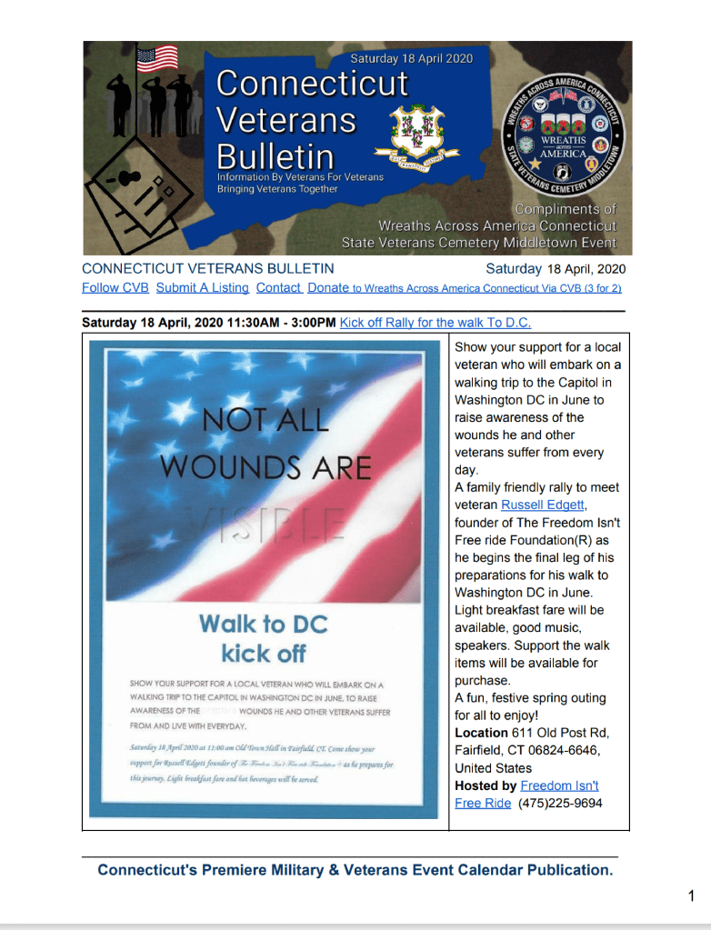 CVB serves Connecticut’s military/veteran community by researching and promoting events of interest from numerous resources. Each CVB event is listed with a dedicated page in bulletin format and remains listed in all subsequent issues, up to the Saturday before the event or the Saturday of the event.