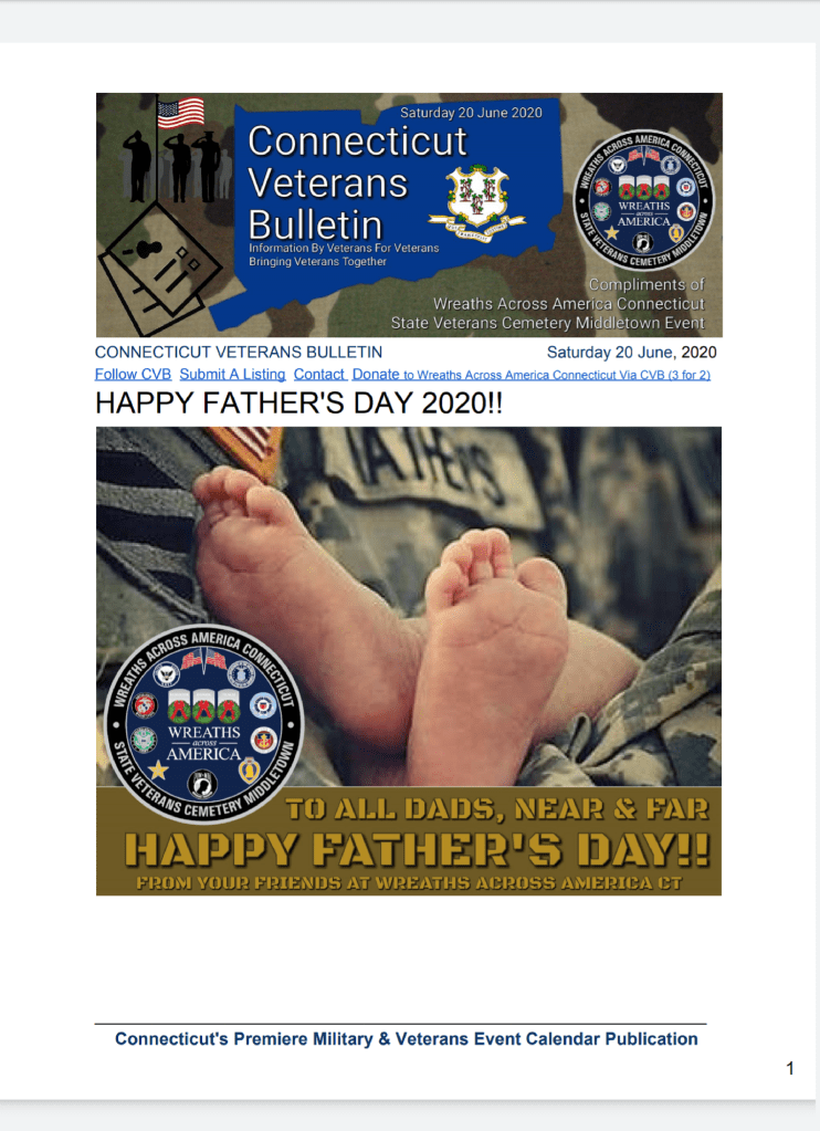 CVB serves Connecticut’s military/veteran community by researching and promoting events of interest from numerous resources. Each CVB event is listed with a dedicated page in bulletin format and remains listed in all subsequent issues, up to the Saturday before the event or the Saturday of the event.