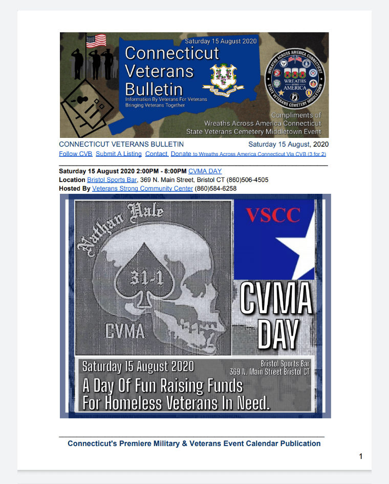 CVB serves Connecticut’s military/veteran community by researching and promoting events of interest from numerous resources. Each CVB event is listed with a dedicated page in bulletin format and remains listed in all subsequent issues, up to the Saturday before the event or the Saturday of the event.