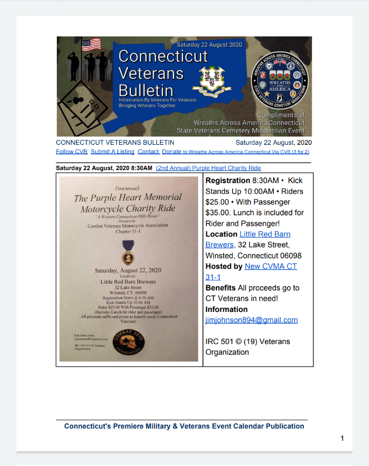 CVB serves Connecticut’s military/veteran community by researching and promoting events of interest from numerous resources. Each CVB event is listed with a dedicated page in bulletin format and remains listed in all subsequent issues, up to the Saturday before the event or the Saturday of the event.