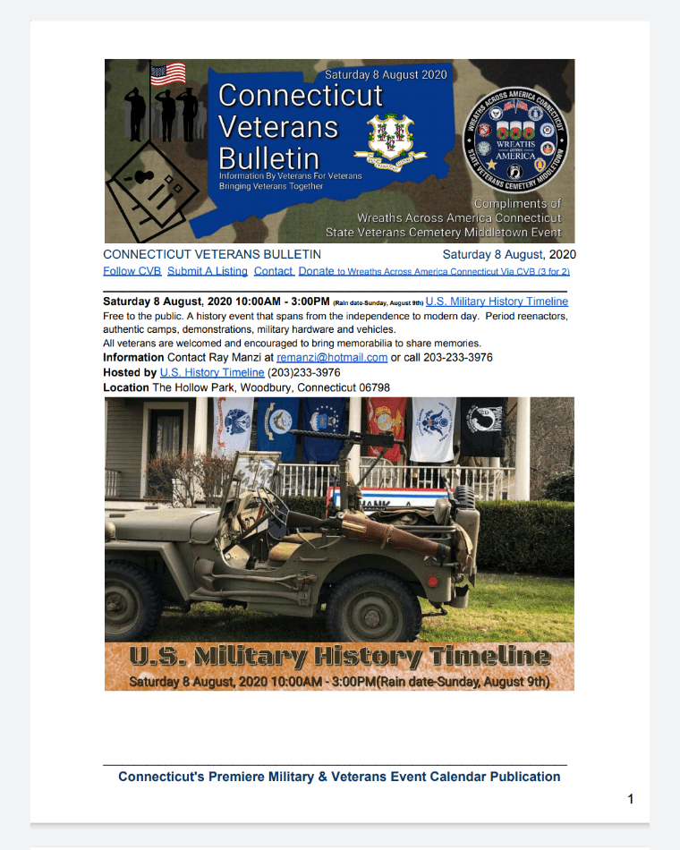 CVB serves Connecticut’s military/veteran community by researching and promoting events of interest from numerous resources. Each CVB event is listed with a dedicated page in bulletin format and remains listed in all subsequent issues, up to the Saturday before the event or the Saturday of the event.