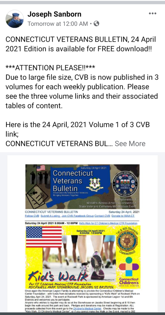 Due to large file size, the CONNECTICUT VETERANS BULLETIN weekly PDF publication will now be published in 3 volumes for each weekly publication. Please look for the three volume links and their associated tables of content each week.