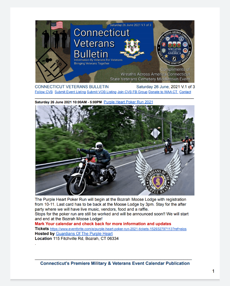 CVB serves Connecticut’s military/veteran community by researching and promoting events of interest from numerous resources. Each CVB event is listed with a dedicated page in bulletin format and remains listed in all subsequent issues, up to the Saturday before the event or the Saturday of the event.