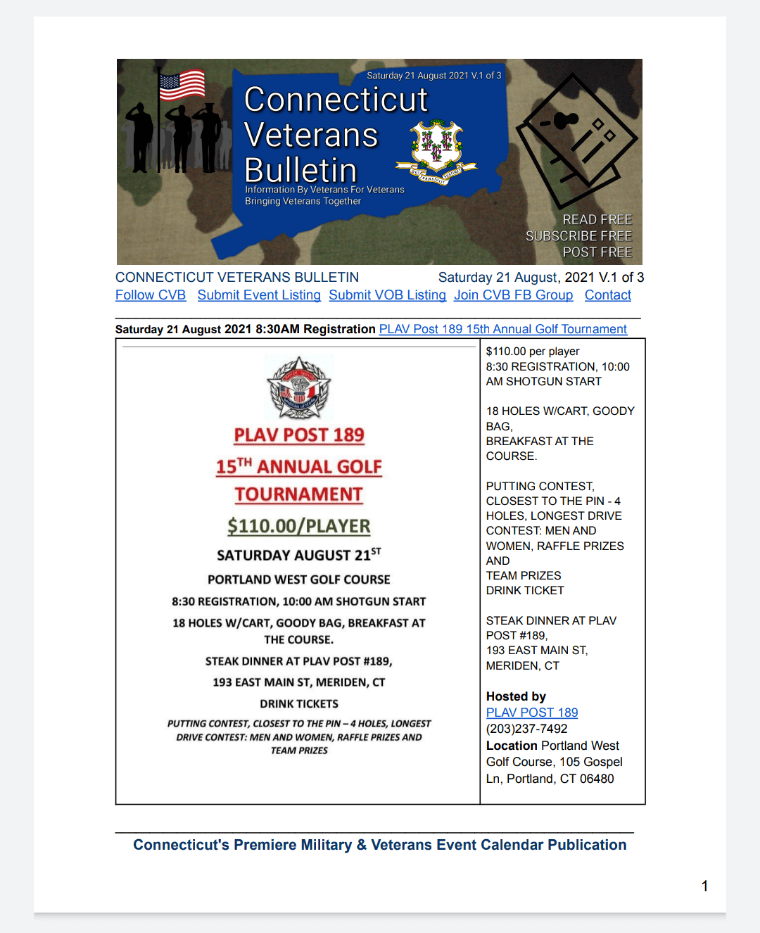 CVB serves Connecticut’s military/veteran community by researching and promoting events of interest from numerous resources. Each CVB event is listed with a dedicated page in bulletin format and remains listed in all subsequent issues, up to the Saturday before the event or the Saturday of the event.