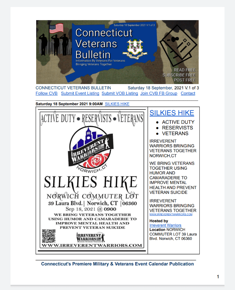 CVB serves Connecticut’s military/veteran community by researching and promoting events of interest from numerous resources. Each CVB event is listed with a dedicated page in bulletin format and remains listed in all subsequent issues, up to the Saturday before the event or the Saturday of the event.