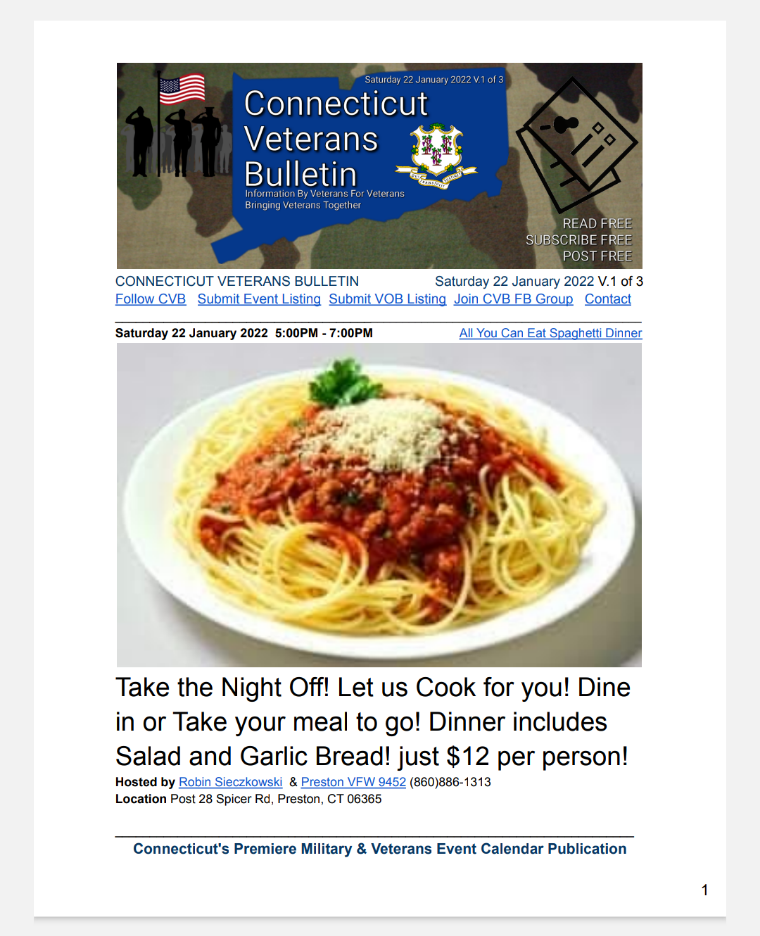 CONNECTICUT VETERANS BULLETIN, Saturday 22 January 2022 Edition is available for FREE download!!