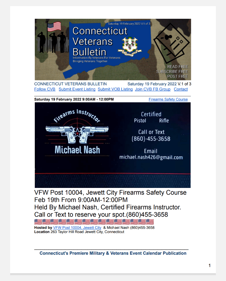 CVB serves Connecticut’s military/veteran community by researching and promoting events of interest from numerous resources. Each CVB event is listed with a dedicated page in bulletin format and remains listed in all subsequent issues, up to the Saturday before the event or the Saturday of the event.