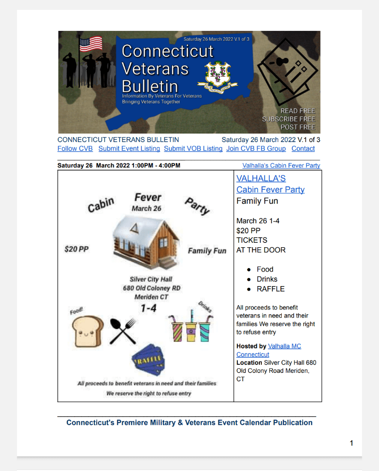CVB serves Connecticut’s military/veteran community by researching and promoting events of interest from numerous resources. Each CVB event is listed with a dedicated page in bulletin format and remains listed in all subsequent issues, up to the Saturday before the event or the Saturday of the event.