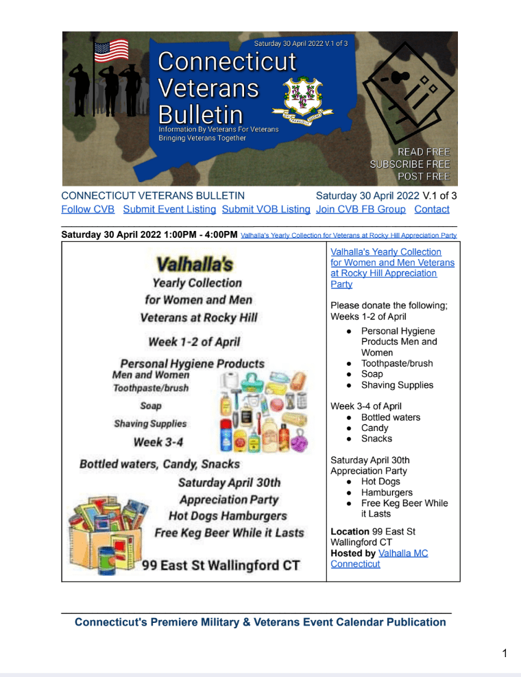 CVB serves Connecticut’s military/veteran community by researching and promoting events of interest from numerous resources. Each CVB event is listed with a dedicated page in bulletin format and remains listed in all subsequent issues, up to the Saturday before the event or the Saturday of the event.