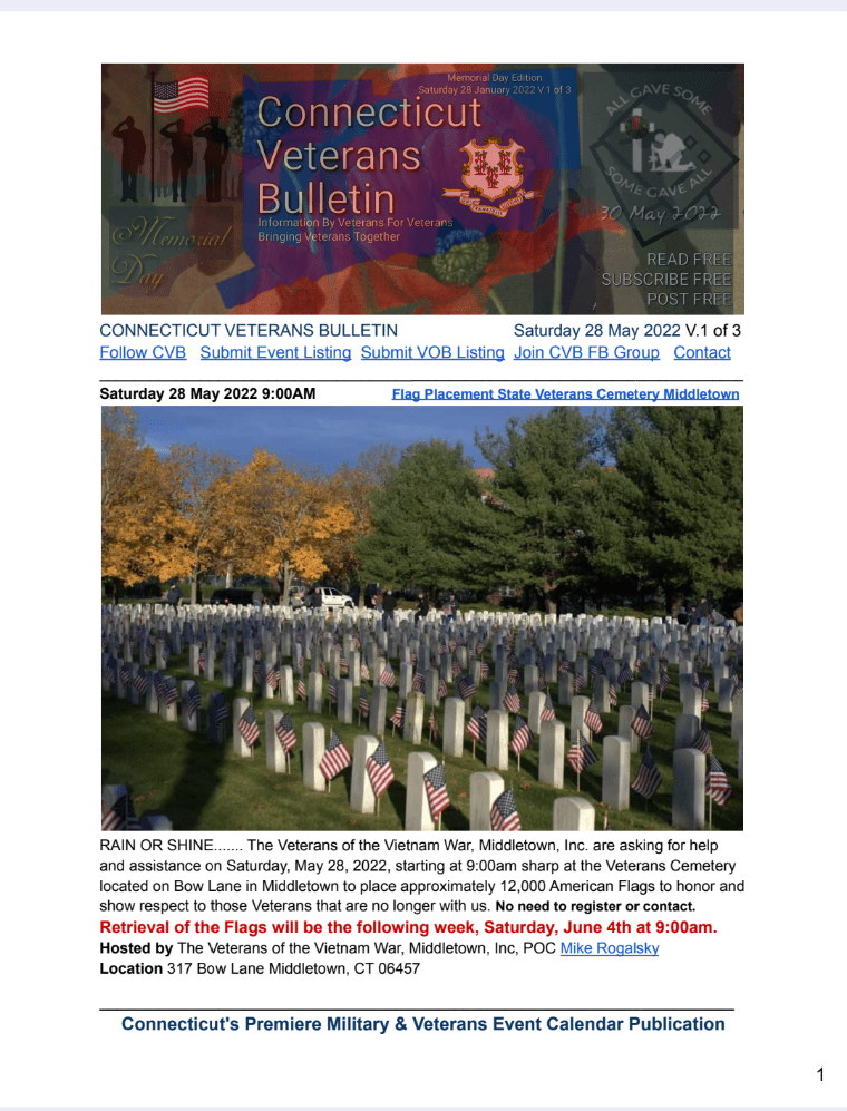 CVB serves Connecticut’s military/veteran community by researching and promoting events of interest from numerous resources. Each CVB event is listed with a dedicated page in bulletin format and remains listed in all subsequent issues, up to the Saturday before the event or the Saturday of the event.