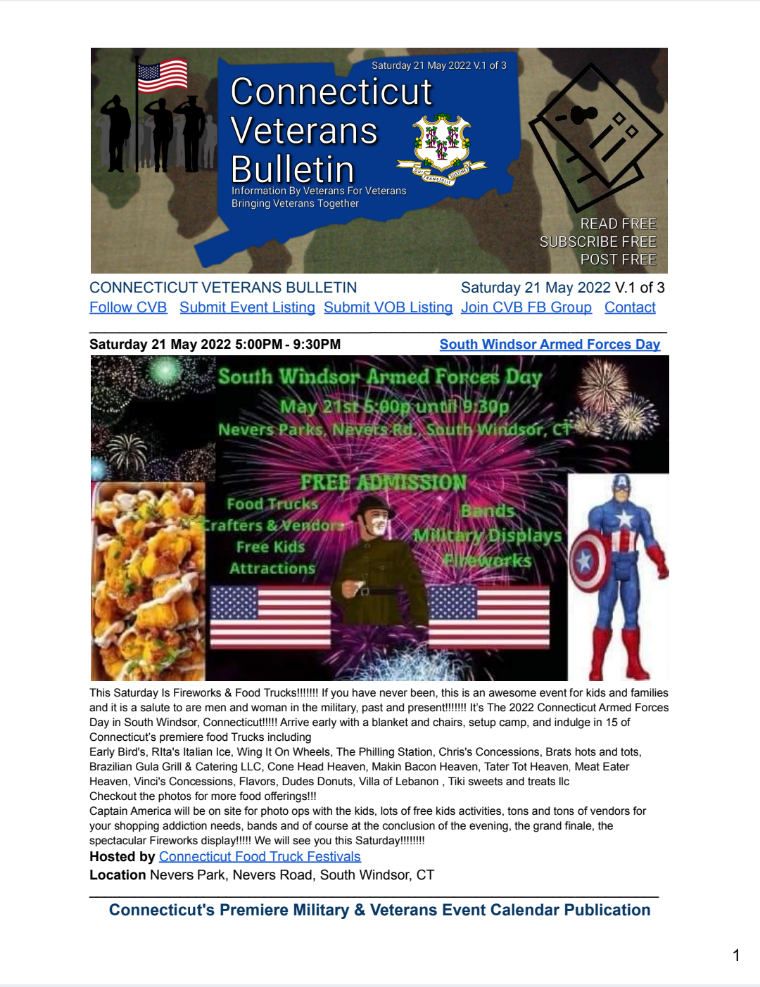 CONNECTICUT VETERANS BULLETIN, Saturday 21 May 2022 Edition is available for FREE download!!