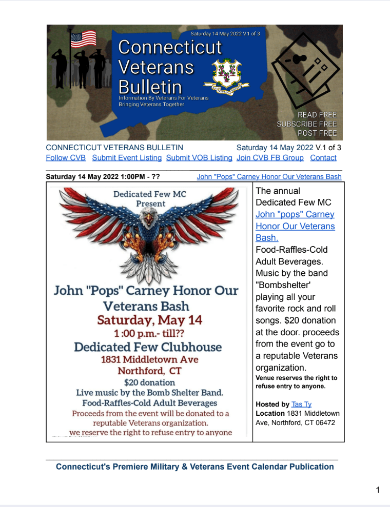 CVB serves Connecticut’s military/veteran community by researching and promoting events of interest from numerous resources. Each CVB event is listed with a dedicated page in bulletin format and remains listed in all subsequent issues, up to the Saturday before the event or the Saturday of the event.