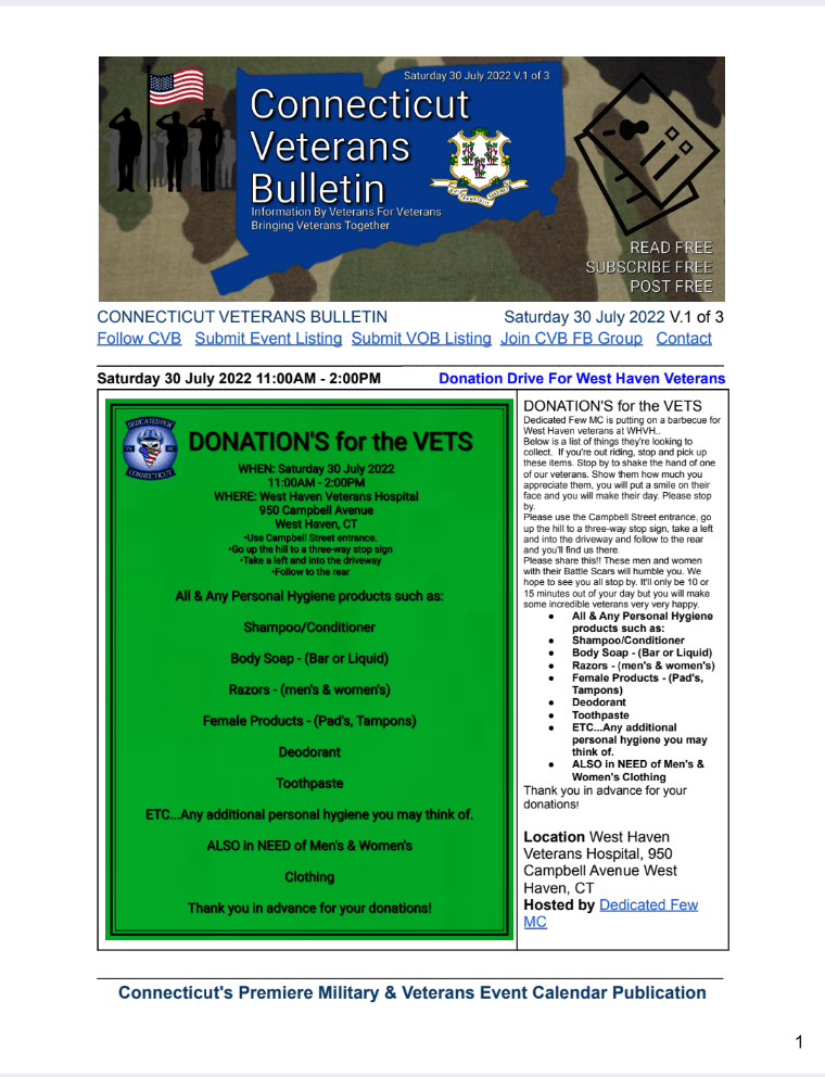 CONNECTICUT VETERANS BULLETIN Saturday 30 July 2022 Edition is available for FREE download!!
