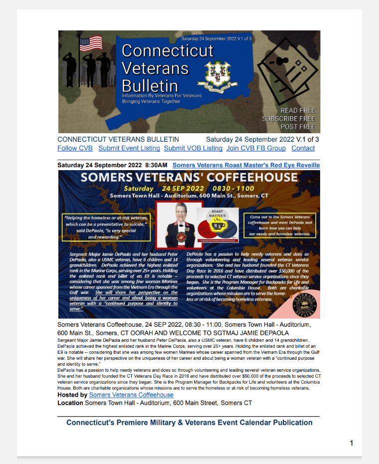 CVB serves Connecticut’s military/veteran community by researching and promoting events of interest from numerous resources. Each CVB event is listed with a dedicated page in bulletin format and remains listed in all subsequent issues, up to the Saturday before the event or the Saturday of the event.