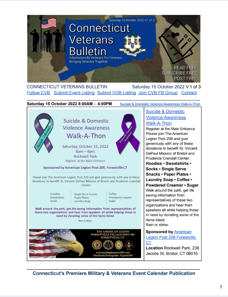 CVB serves Connecticut’s military/veteran community by researching and promoting events of interest from numerous resources. Each CVB event is listed with a dedicated page in bulletin format and remains listed in all subsequent issues, up to the Saturday before the event or the Saturday of the event.