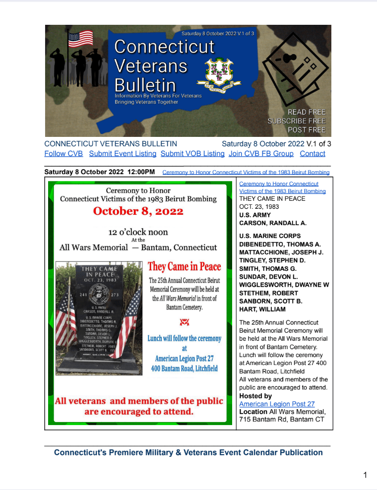 CONNECTICUT VETERANS BULLETIN Saturday 8 October 2022 Edition is available for FREE download!!