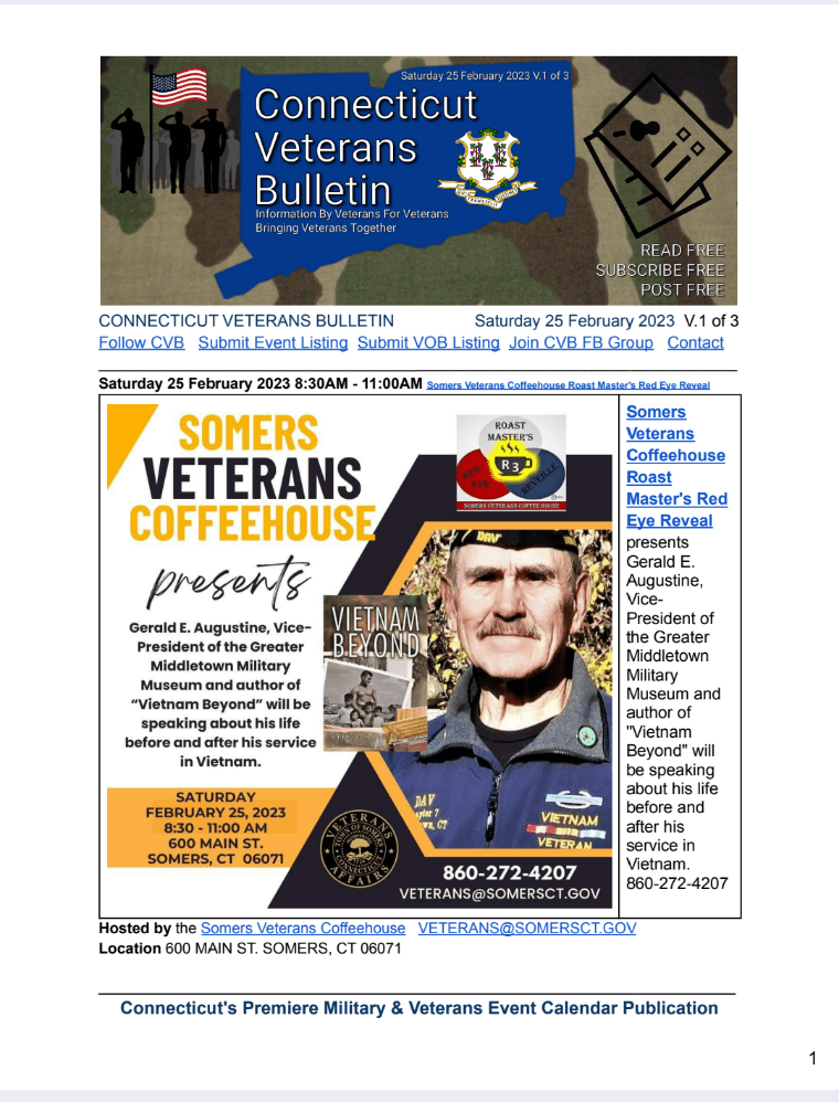 CVB serves Connecticut’s military/veteran community by researching and promoting events and programs of interest from numerous resources in a weekly PDF publication and on social media platforms. Each event is listed in CVB’S Weekly PDF with a dedicated page and remains listed in all subsequent PDF issues, up to the Saturday before the event or the Saturday of the event.