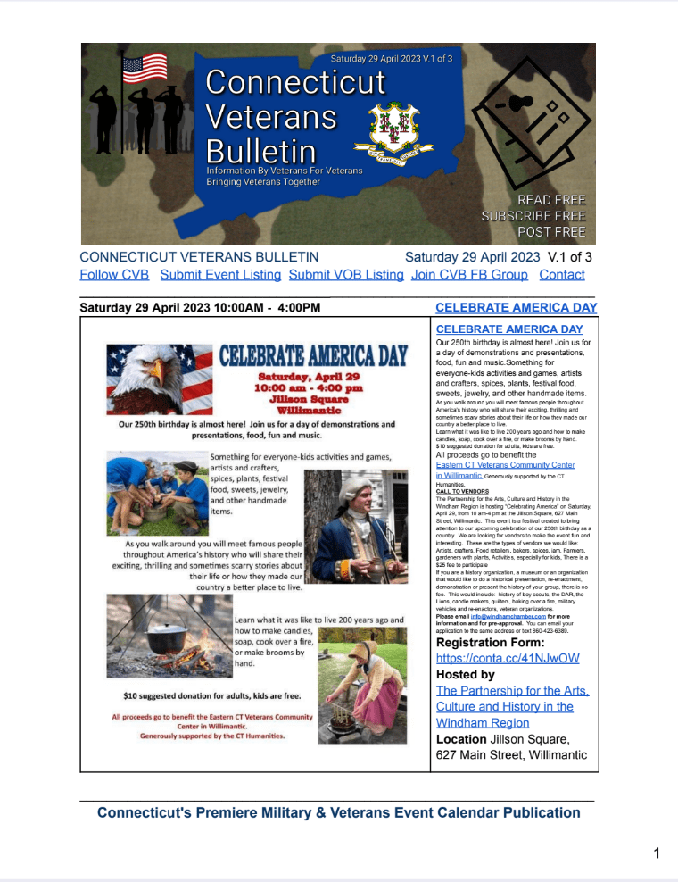 CVB serves Connecticut’s military/veteran community by researching and promoting events and programs of interest from numerous resources in a weekly PDF publication and on social media platforms. Each event is listed in CVB’S Weekly PDF with a dedicated page and remains listed in all subsequent PDF issues, up to the Saturday before the event or the Saturday of the event.