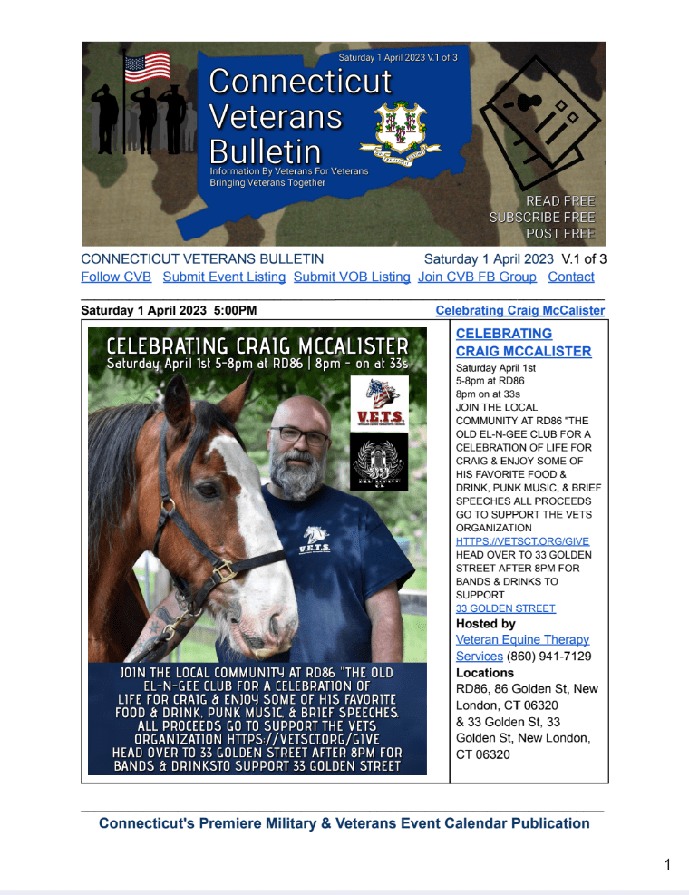 CVB serves Connecticut’s military/veteran community by researching and promoting events and programs of interest from numerous resources in a weekly PDF publication and on social media platforms. Each event is listed in CVB’S Weekly PDF with a dedicated page and remains listed in all subsequent PDF issues, up to the Saturday before the event or the Saturday of the event.