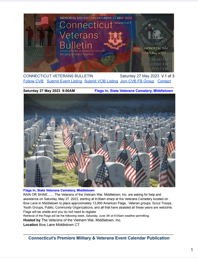 CVB serves Connecticut’s military/veteran community by researching and promoting events and programs of interest from numerous resources in a weekly PDF publication and on social media platforms. Each event is listed in CVB’S Weekly PDF with a dedicated page and remains listed in all subsequent PDF issues, up to the Saturday before the event or the Saturday of the event.