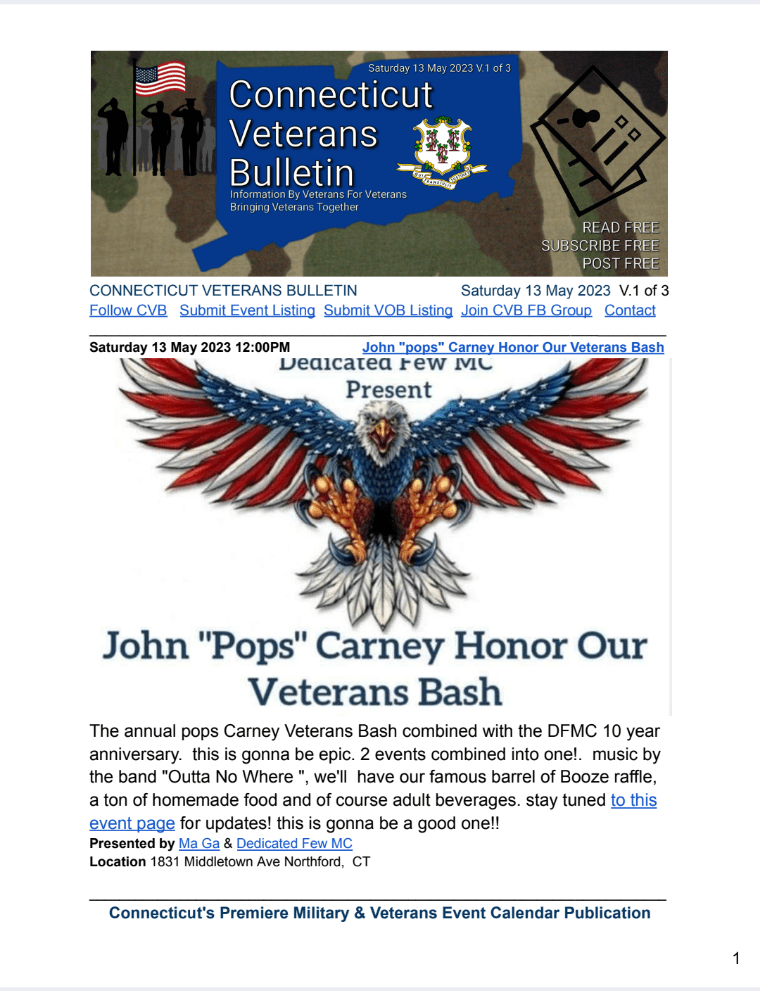 CVB serves Connecticut’s military/veteran community by researching and promoting events and programs of interest from numerous resources in a weekly PDF publication and on social media platforms. Each event is listed in CVB’S Weekly PDF with a dedicated page and remains listed in all subsequent PDF issues, up to the Saturday before the event or the Saturday of the event.