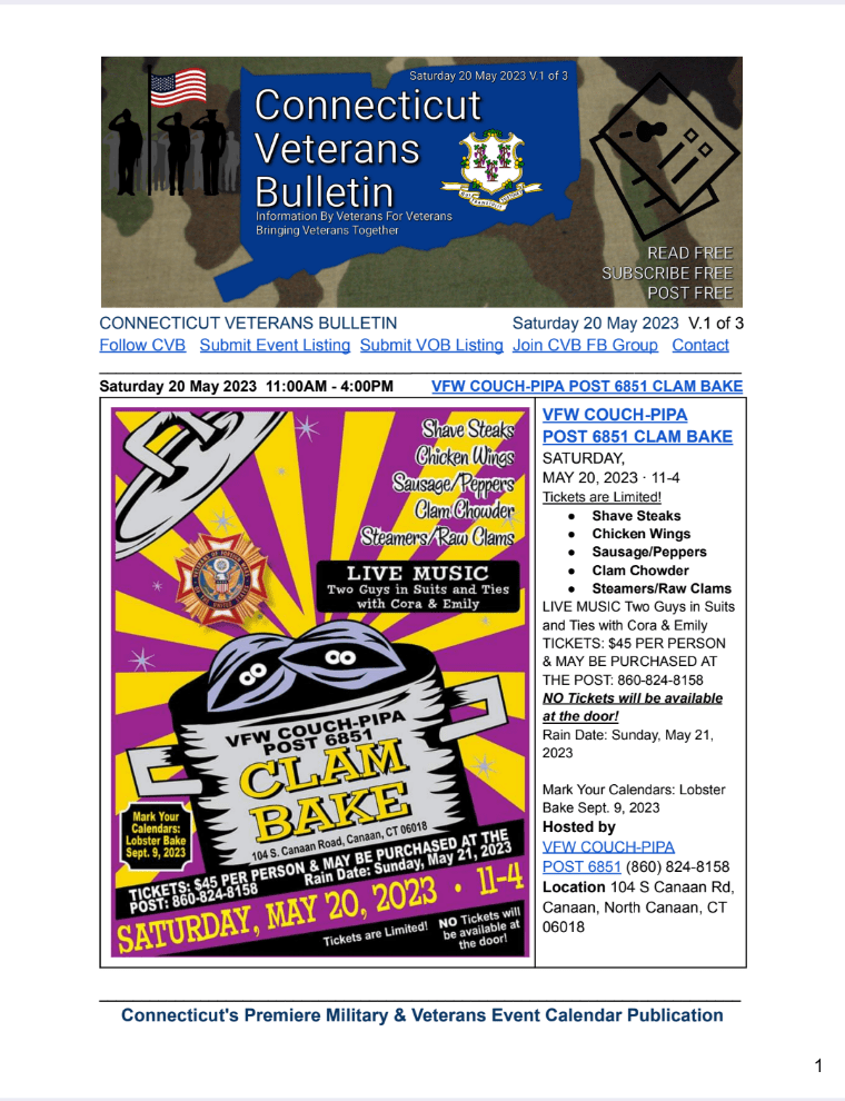 CVB serves Connecticut’s military/veteran community by researching and promoting events and programs of interest from numerous resources in a weekly PDF publication and on social media platforms. Each event is listed in CVB’S Weekly PDF with a dedicated page and remains listed in all subsequent PDF issues, up to the Saturday before the event or the Saturday of the event.