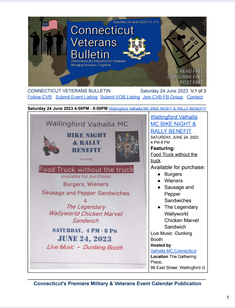 CVB serves Connecticut’s military/veteran community by researching and promoting events and programs of interest from numerous resources in a weekly PDF publication and on social media platforms. Each event is listed in CVB’S Weekly PDF with a dedicated page and remains listed in all subsequent PDF issues, up to the Saturday before the event or the Saturday of the event.