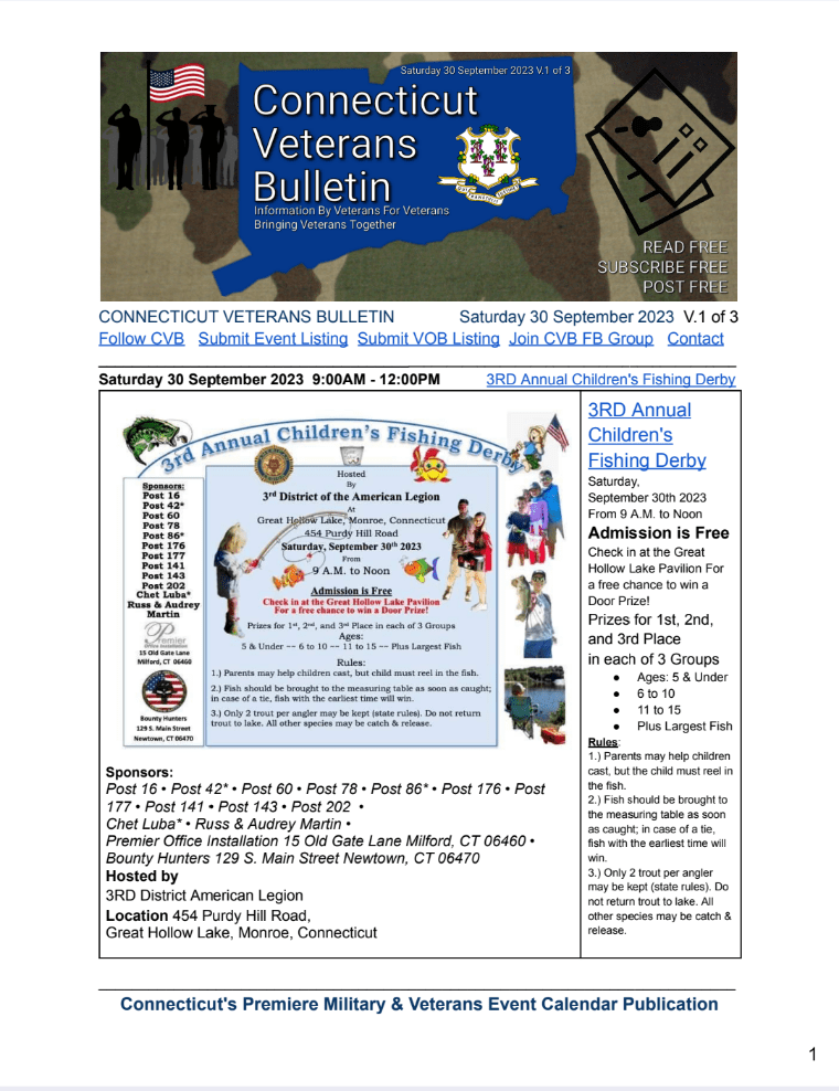 CVB serves Connecticut’s military/veteran community by researching and promoting events and programs of interest from numerous resources in a weekly PDF publication and on social media platforms. Each event is listed in CVB’S Weekly PDF with a dedicated page and remains listed in all subsequent PDF issues, up to the Saturday before the event or the Saturday of the event.