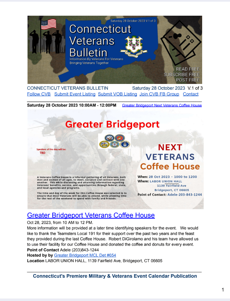 CVB serves Connecticut’s military/veteran community by researching and promoting events and programs of interest from numerous resources in a weekly PDF publication and on social media platforms. Each event is listed in CVB’S Weekly PDF with a dedicated page and remains listed in all subsequent PDF issues, up to the Saturday before the event or the Saturday of the event.