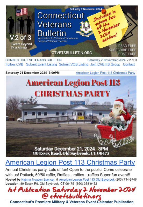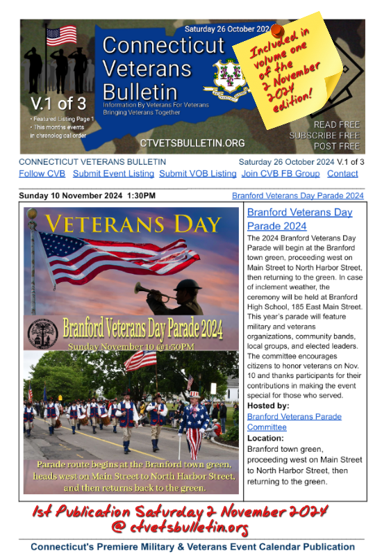 Listed in the Connecticut Veterans Calendar on ctvetsbulletin.org for Saturday, 2 November, 2024.