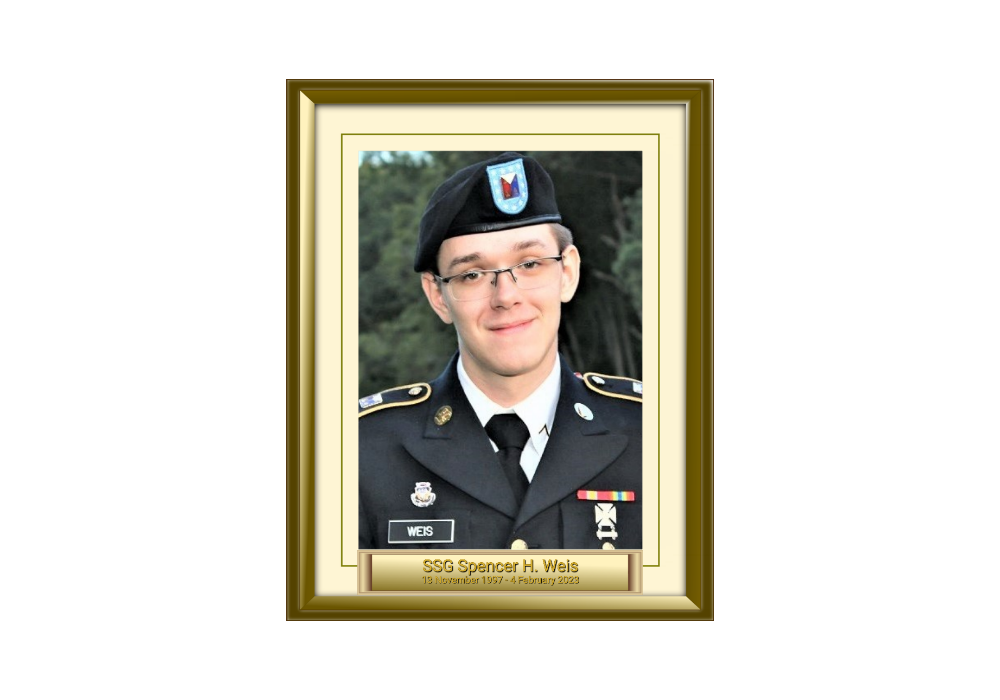 Staff Sergeant Spencer H. Weis, a cherished son, brother, and friend, was remembered fondly for his kindness, generosity, and dedication to his country and community. Born on November 13, 1997, in Bristol, Connecticut, Spencer was the beloved son of Norman and Nancy (Stone) Weis. He passed away on February 4, 2023, at the age of 25, leaving behind a legacy of compassion, service, and warmth that will forever be cherished by those who knew him.