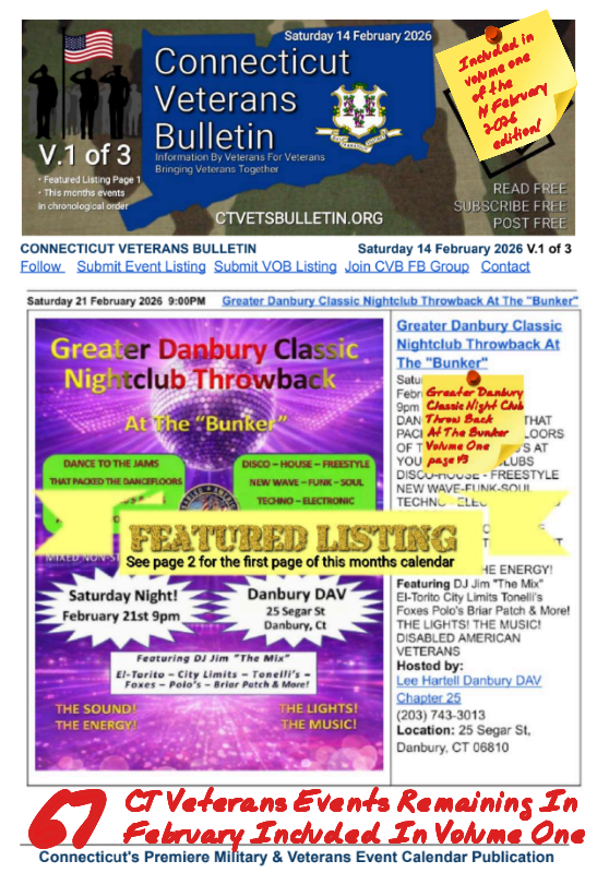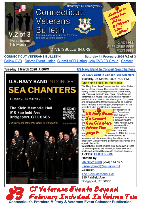 The Saturday 14 February 2026 edition of CVB’s Weekly Connecticut Veterans Calendar Publication brings together 67 verified veterans events remaining in February and 83 additional events extending from March through June 2026, all researched and compiled specifically for Connecticut’s military and veteran community. This edition features the Greater Danbury Classic Night Club Throw Back at The Bunker, the US Navy Band Sea Chanters in concert, and the Veterans Are Heroes Forever Coffee Social, alongside breakfasts, dinners, music, bingo, outreach programs, wellness initiatives, and support services hosted by American Legion posts, VFWs, DAV chapters, and veteran service organizations statewide. Published across three structured volumes, this issue ensures every listed event remains visible and accessible up to the day it occurs, reinforcing CVB’s role as Connecticut’s most comprehensive and continuously updated veterans events calendar.