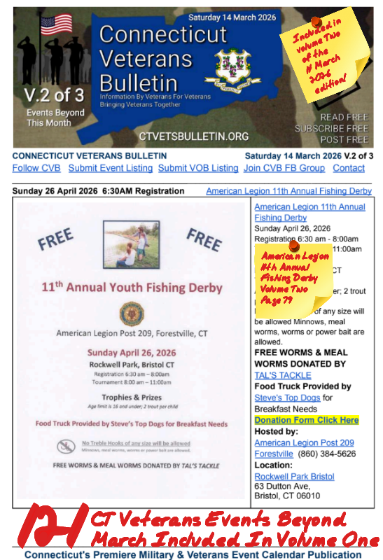 V2 CVB’s Weekly Connecticut Veterans Calendar Publication ST Patrick’s Day Edition Saturday 14 March 2026, American Legion 11th Annual Youth Fishing Derby, Featured Listing