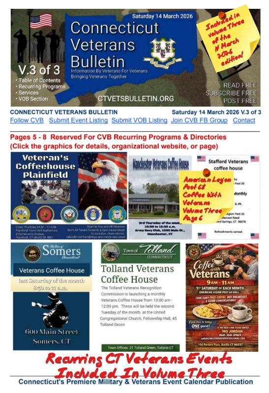 V3 CVB’s Weekly Connecticut Veterans Calendar Publication ST Patrick’s Day Edition Saturday 14 March 2026, American Legion Post 68 Coffee With Veterans, Featured Listing