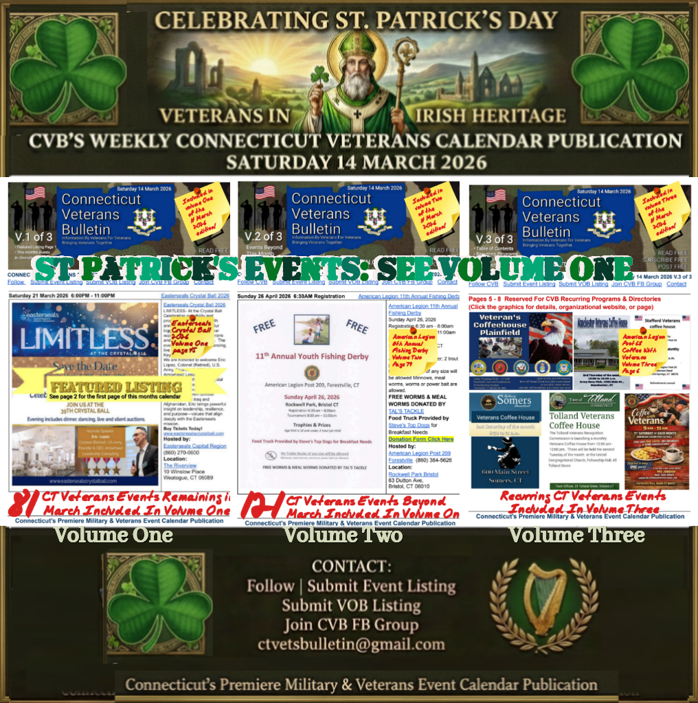 The 14 March 2026 Edition of CVB’s Weekly Connecticut Veterans Calendar Publication includes 82 events for CT Veterans remaining in March. Whereas Volume two Includes 121 events for CT Veterans beyond March. Volume three includes recurring CT Veterans events. Saint Patrick’s Day Events included in Volume One