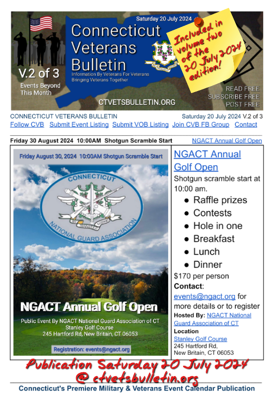 Listed in the Connecticut Veterans Calendar on ctveteransbulletin.org for Saturday, July 20, 2024.