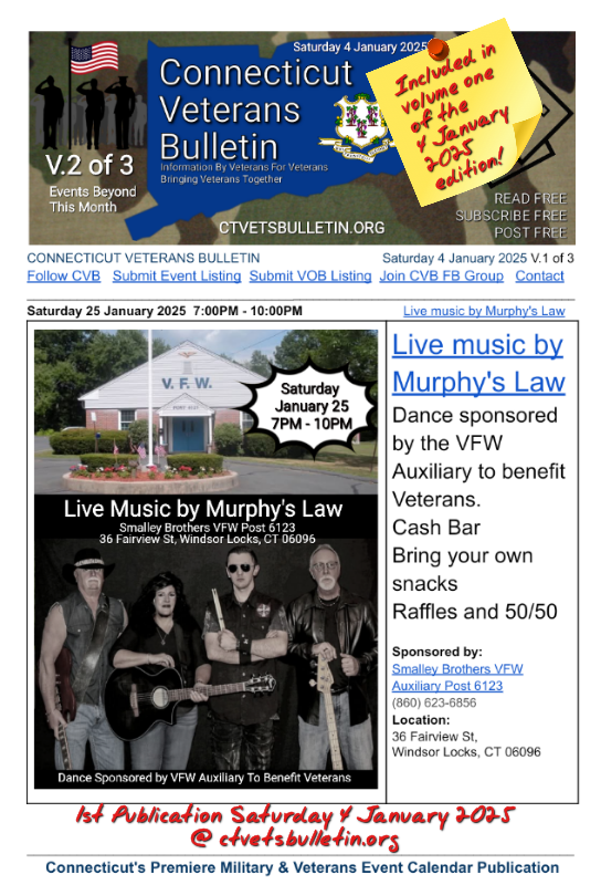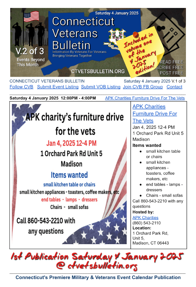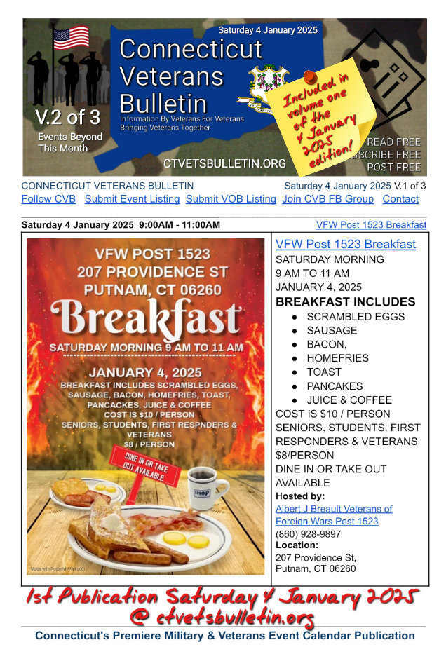 Listed in the Connecticut Veterans Calendar on ctvetsbulletin.org for Saturday, 4 January, 2025