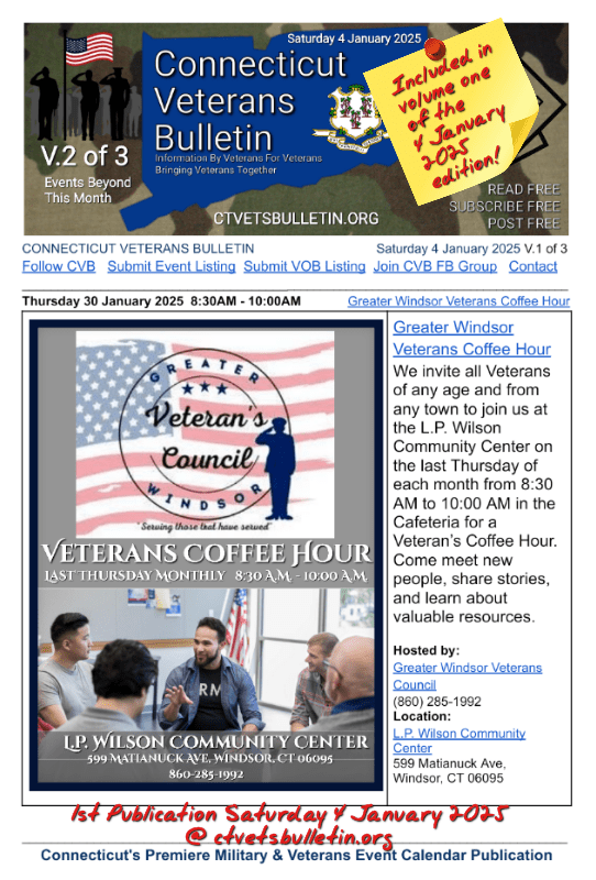 The entries below offer merely a glimpse into the latest additions highlighted in the 4 January edition of Connecticut Veterans Bulletin’s weekly Veterans Calendar Publication. With events and programs tailored for Connecticut veterans, CVB’s weekly Connecticut Veterans Calendar Publication serves as your comprehensive guide.