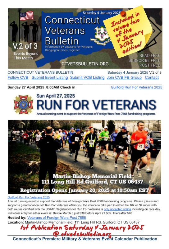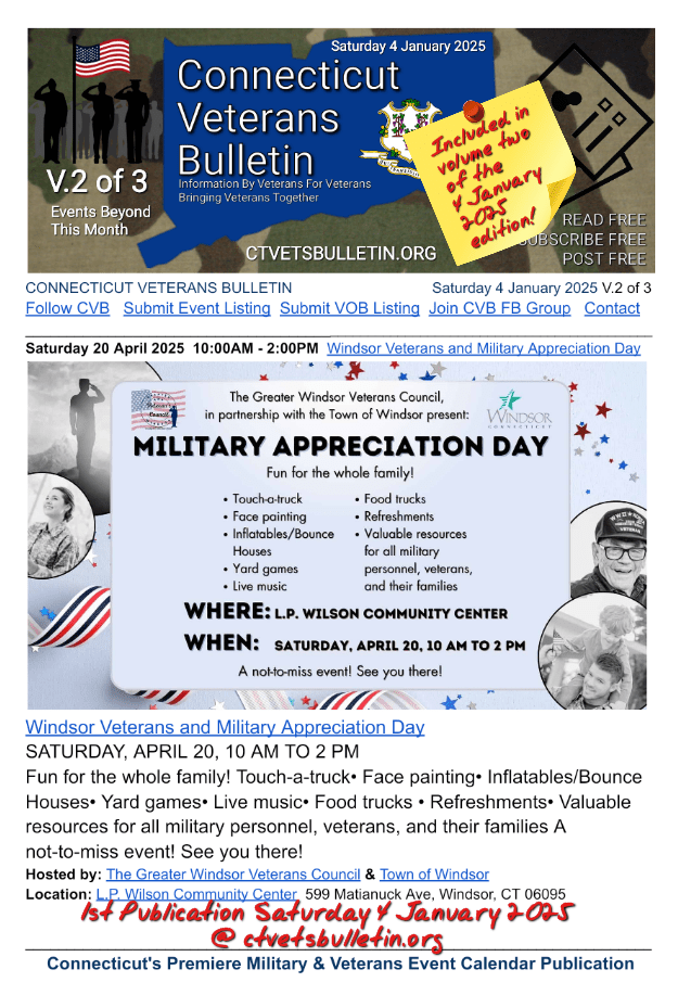 CVB’S 2 January 2025 Thursday Veterans Calendar Preview of Veterans Events & Programs new this week and first appearing in the 4 January 2025 edition of CVB’s Connecticut Veterans Calendar.