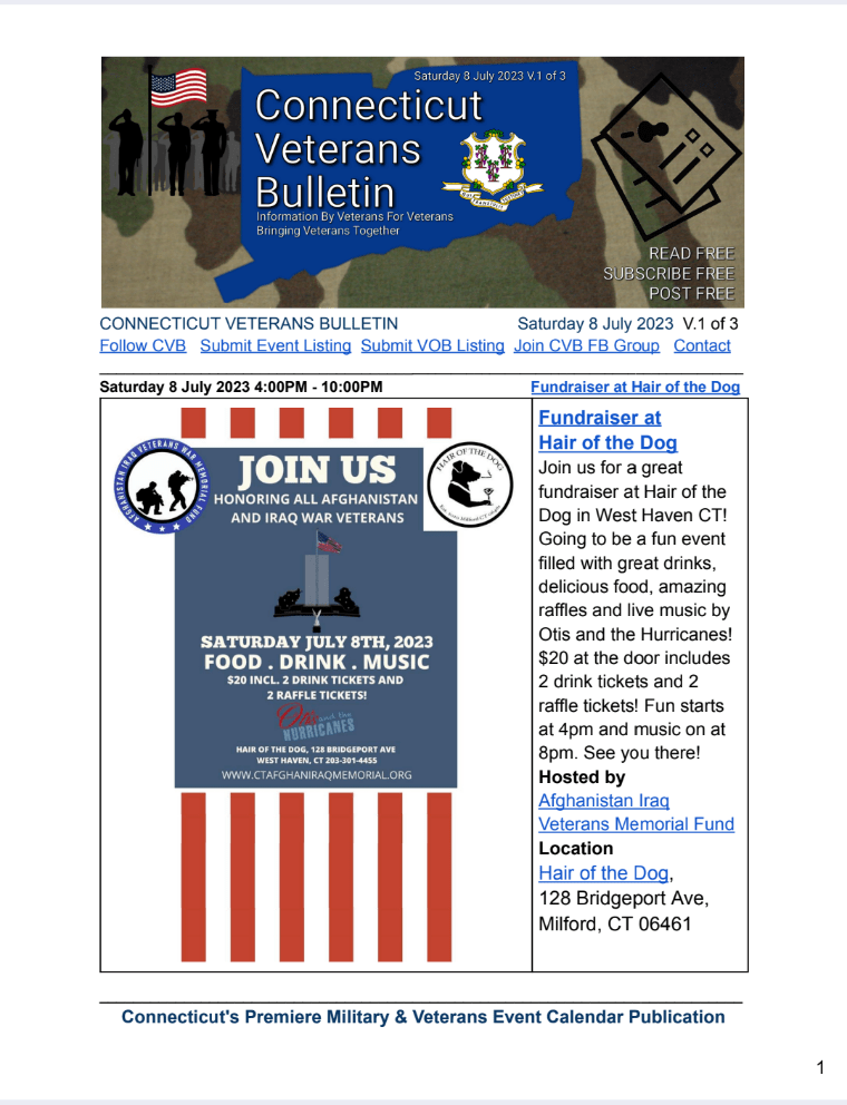 CVB serves Connecticut’s military/veteran community by researching and promoting events and programs of interest from numerous resources in a weekly PDF publication and on social media platforms. Each event is listed in CVB’S Weekly PDF with a dedicated page and remains listed in all subsequent PDF issues, up to the Saturday before the event or the Saturday of the event.